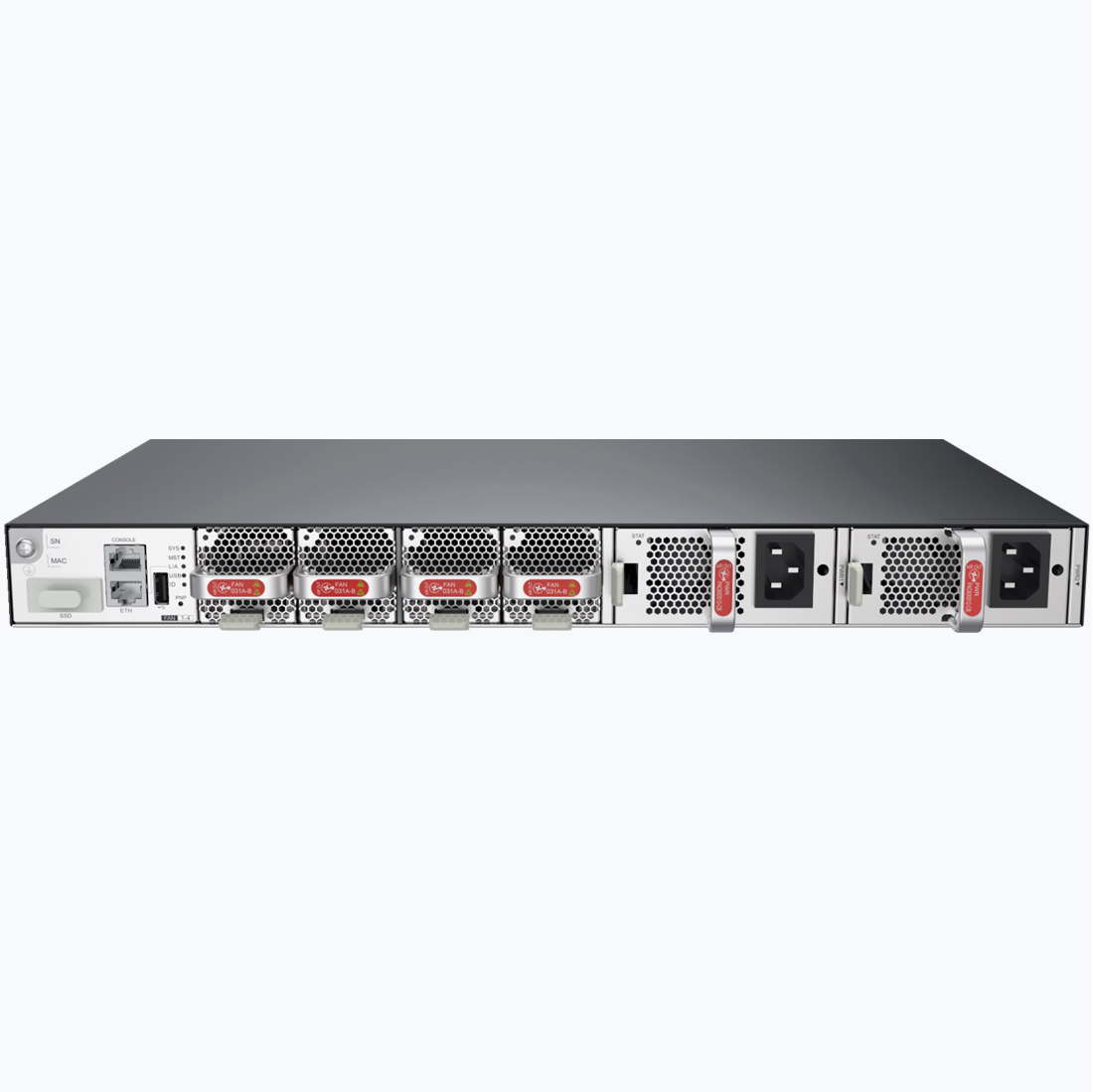 说明:  电源配置方式有单电源供电和双电源供电两种,双电源供电时,电源对主机供电为 1+1 冗余备份方式,支持在同一设备上同时配置可插拔的 AC 和 DC 电源模块